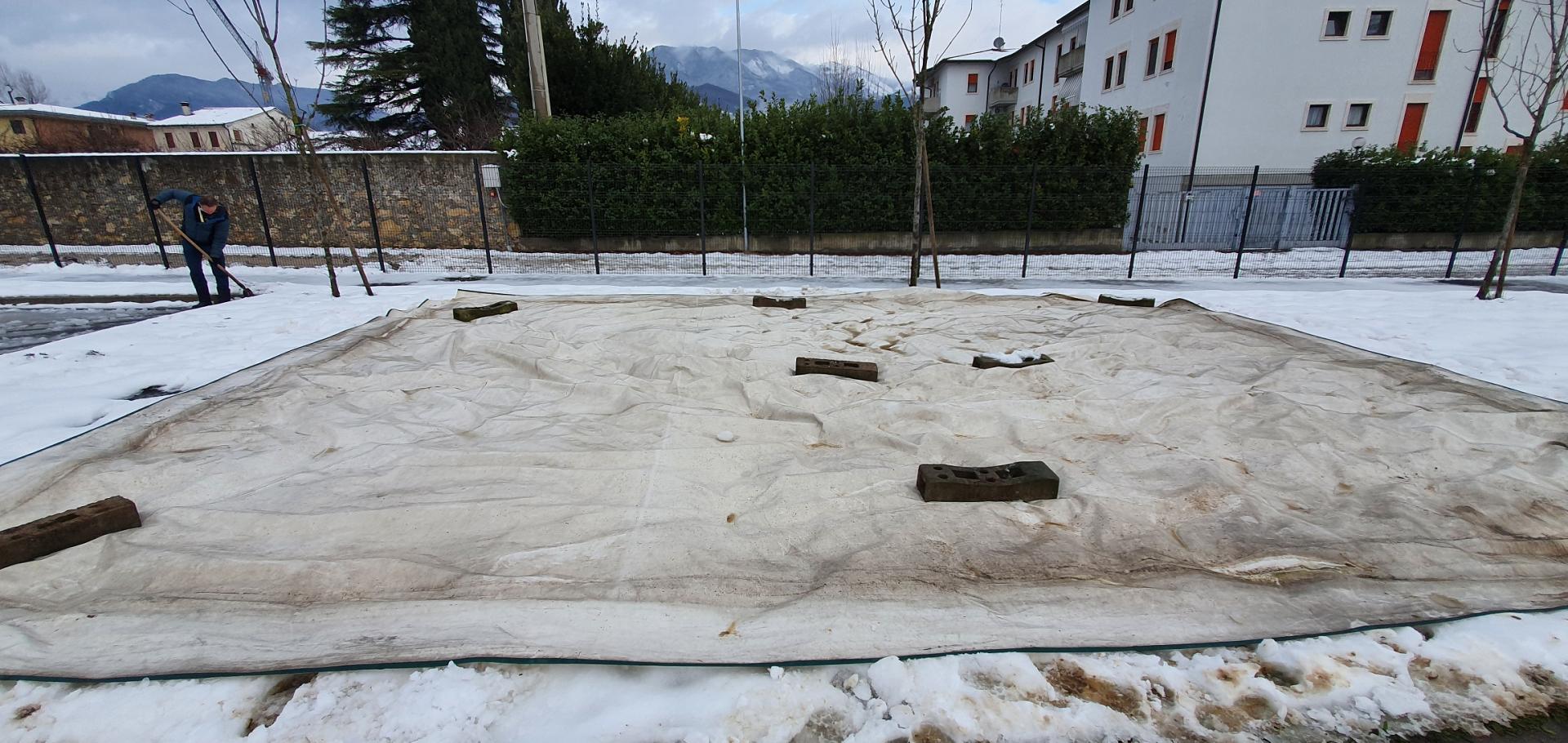 La copiosa nevicata dell'altroieri ha danneggiato la tenso-struttura posizionata dalla parte del cancello carraio.