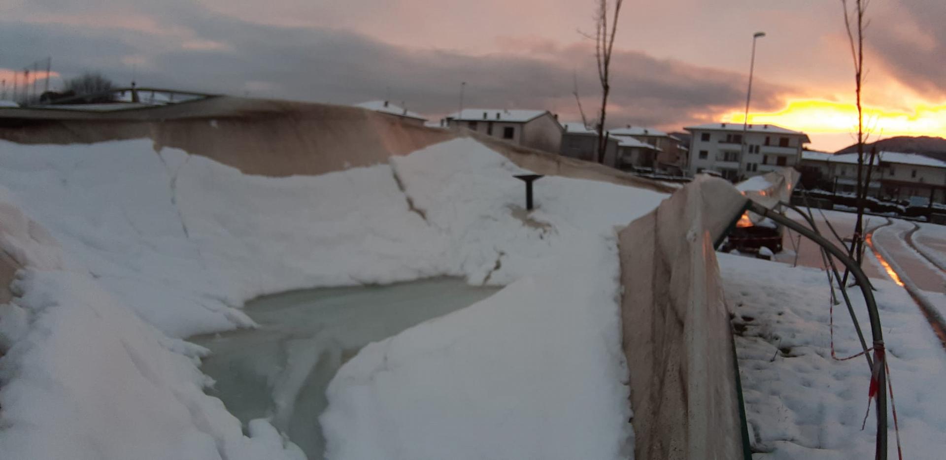 La pioggia del pomeriggio ha impregnato la neve aumentandone notevolmente il peso causando il piegamento dei sostegni di metallo su sè stessi.