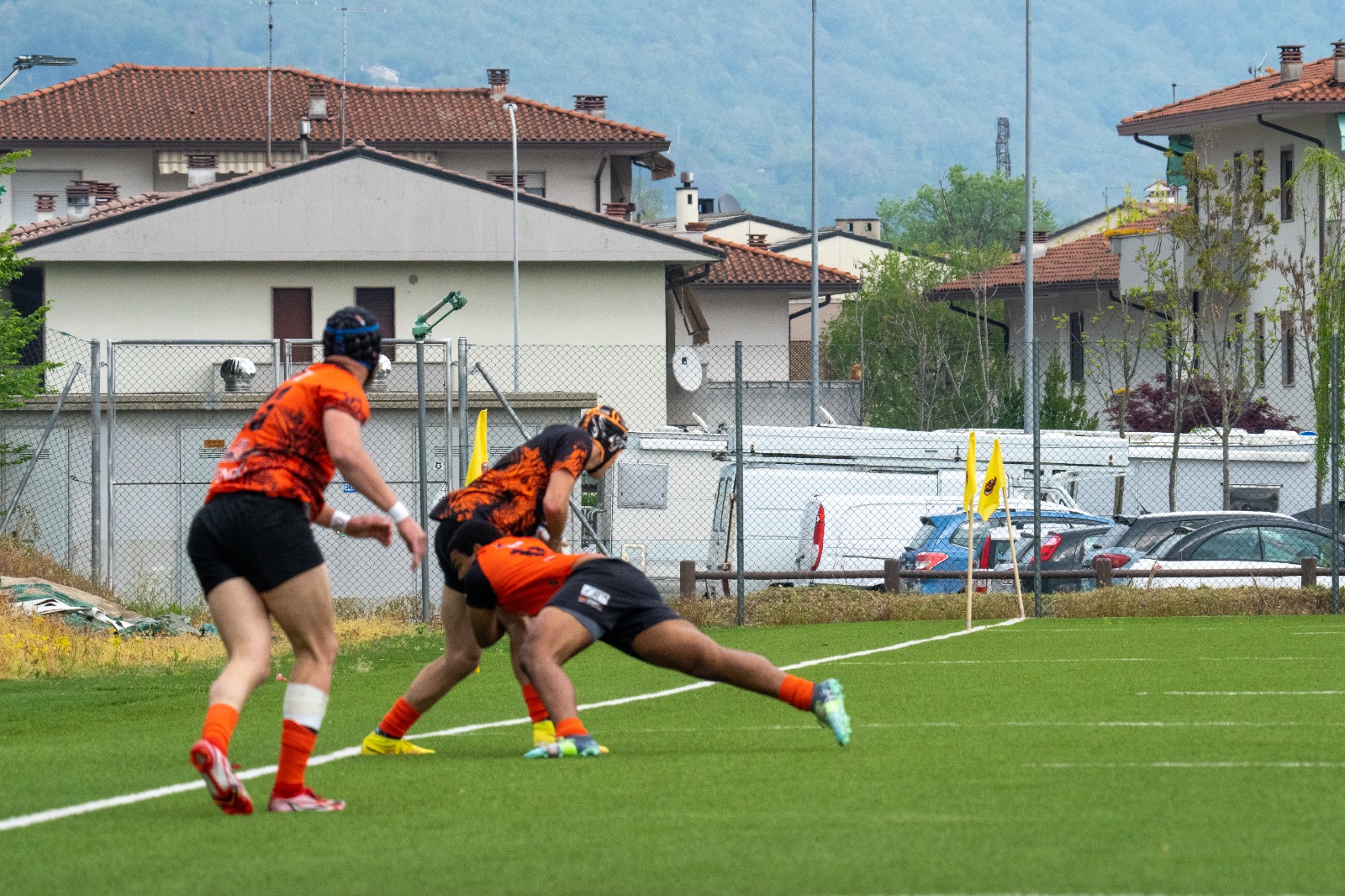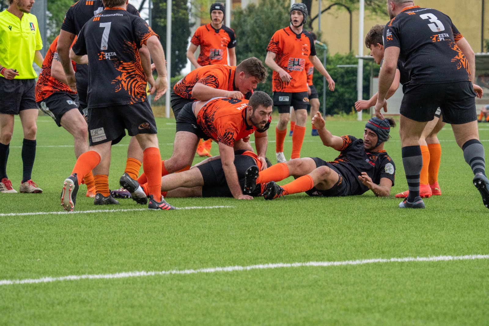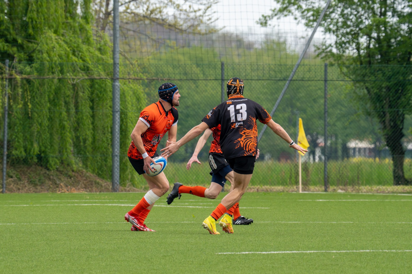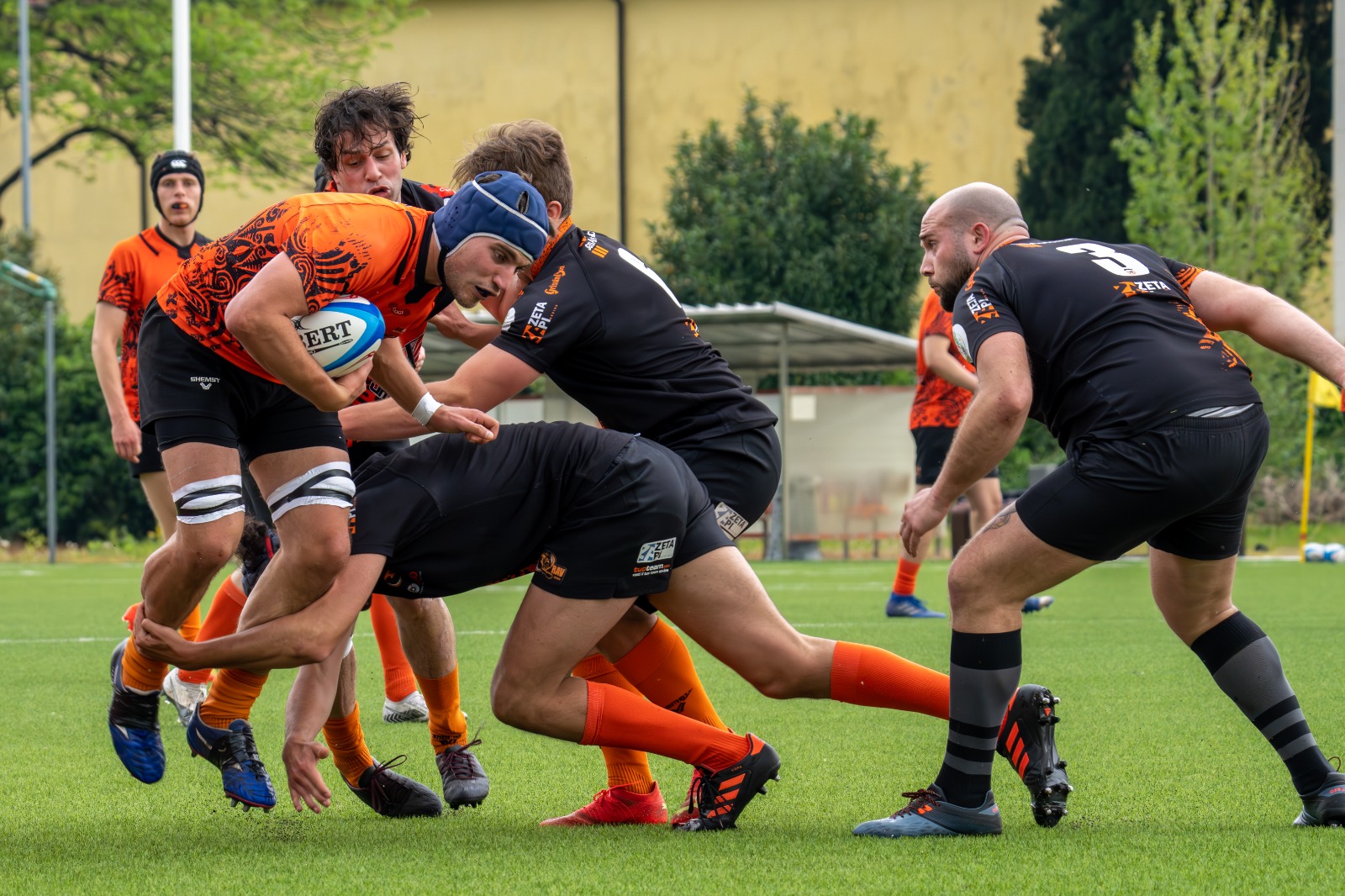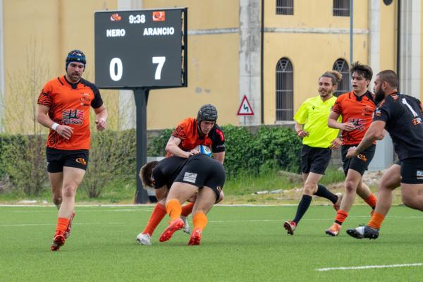 Altra cosa la ripresa con i Neri, strigliati a dovere dal Mr. Rangone che motiva i ragazzi a dare di più, e si vede che il cambio di passo e la pressione portata danno i frutti sperati, prima con una meta che vale l’avvicinamento 17-19 poi il sorpasso per il 22-19 ed infine un calcio che vale il 25-19. Gli Arancio non ci stanno ed in un ennesimo capovolgimento di fronte segnano con un ritrovato Prosdocimi e dopo la trasformazione si portano sul 25-26. Mancano 10 minuti ed i Neri con notevole caparbietà e prestanza fisica riescono a segnare ben 2 mete chiudendo l’incontro sul 35-26.
