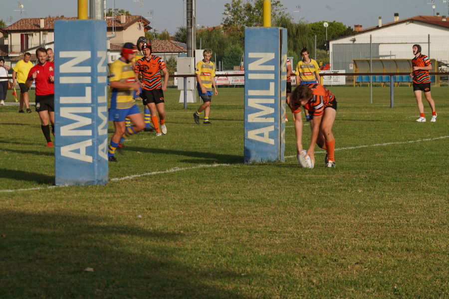 Parte bene il Frassinelle con una certa pressione iniziale, ma al primo ribaltamento di fronte il RAV guadagna un calcio di punizione prontamente trasformato da Cicciù. Al 6° RAV 3 Frassinelle 0 passano 4 minuti dalla riporesa del gioco e da una velocissima azione del RAV sbuca Penzo che schiaccia in meta, la trasformazione esce di poco, ma 3 min. più tardi replica di Penzo e questa volta i punti addizionali di Cicciù arrivano ed al 13° RAV 15 Frassinelle 0.