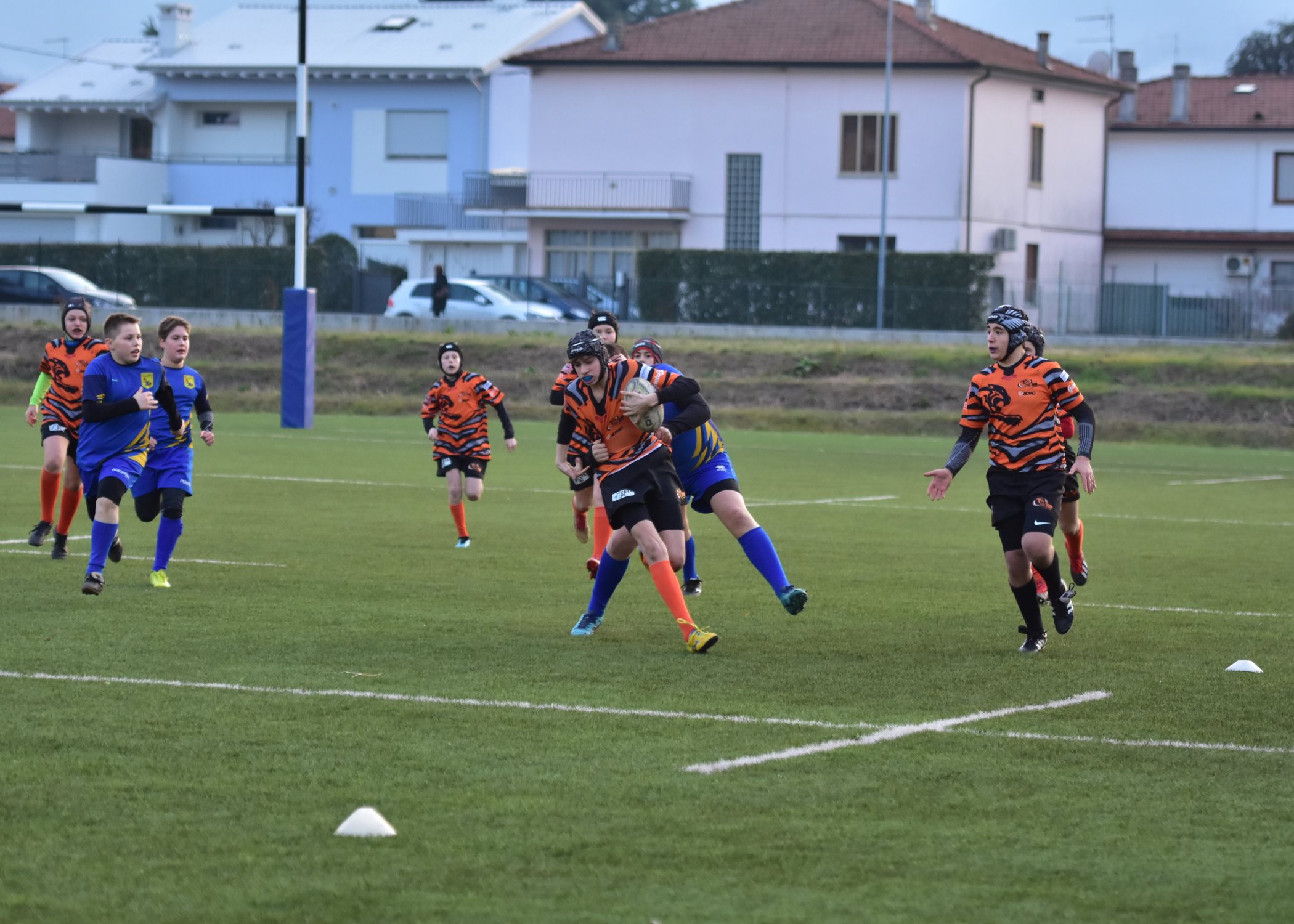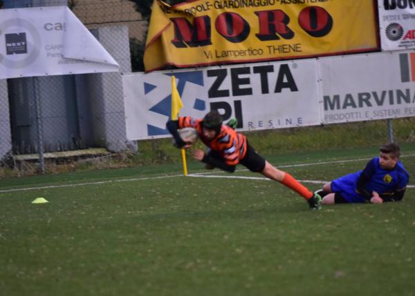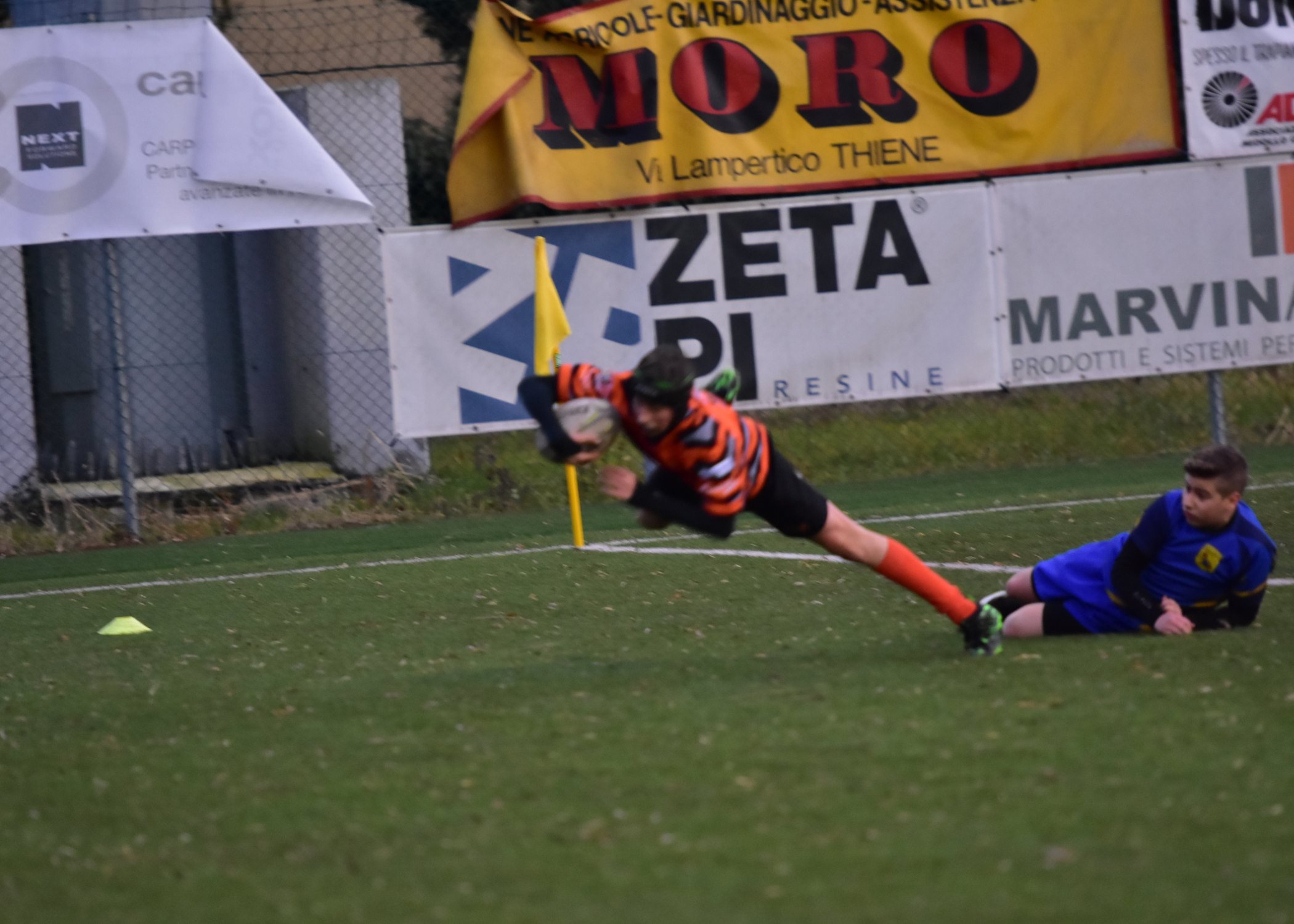 Davide Tisato che a gambe levate corre verso la meta avversaria posando l’ovale sotto i pali permettendo la trasformazione a Lorenzo Meggiorin chiudono la partita con il punteggio di 44 a 5.