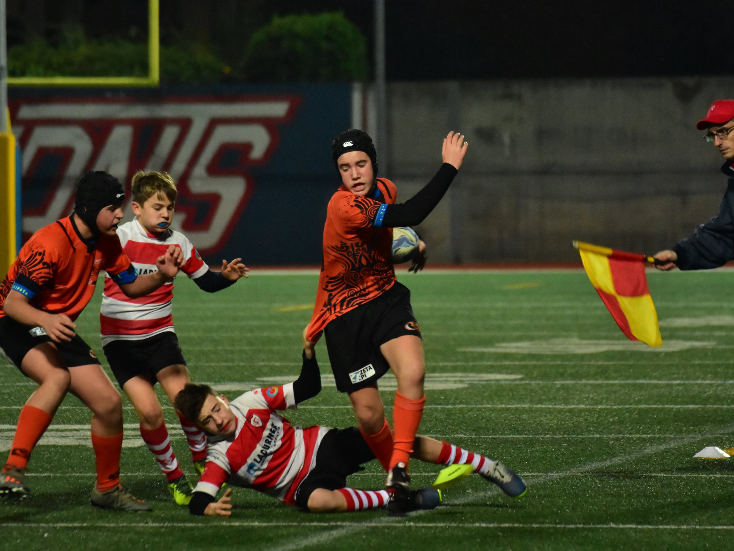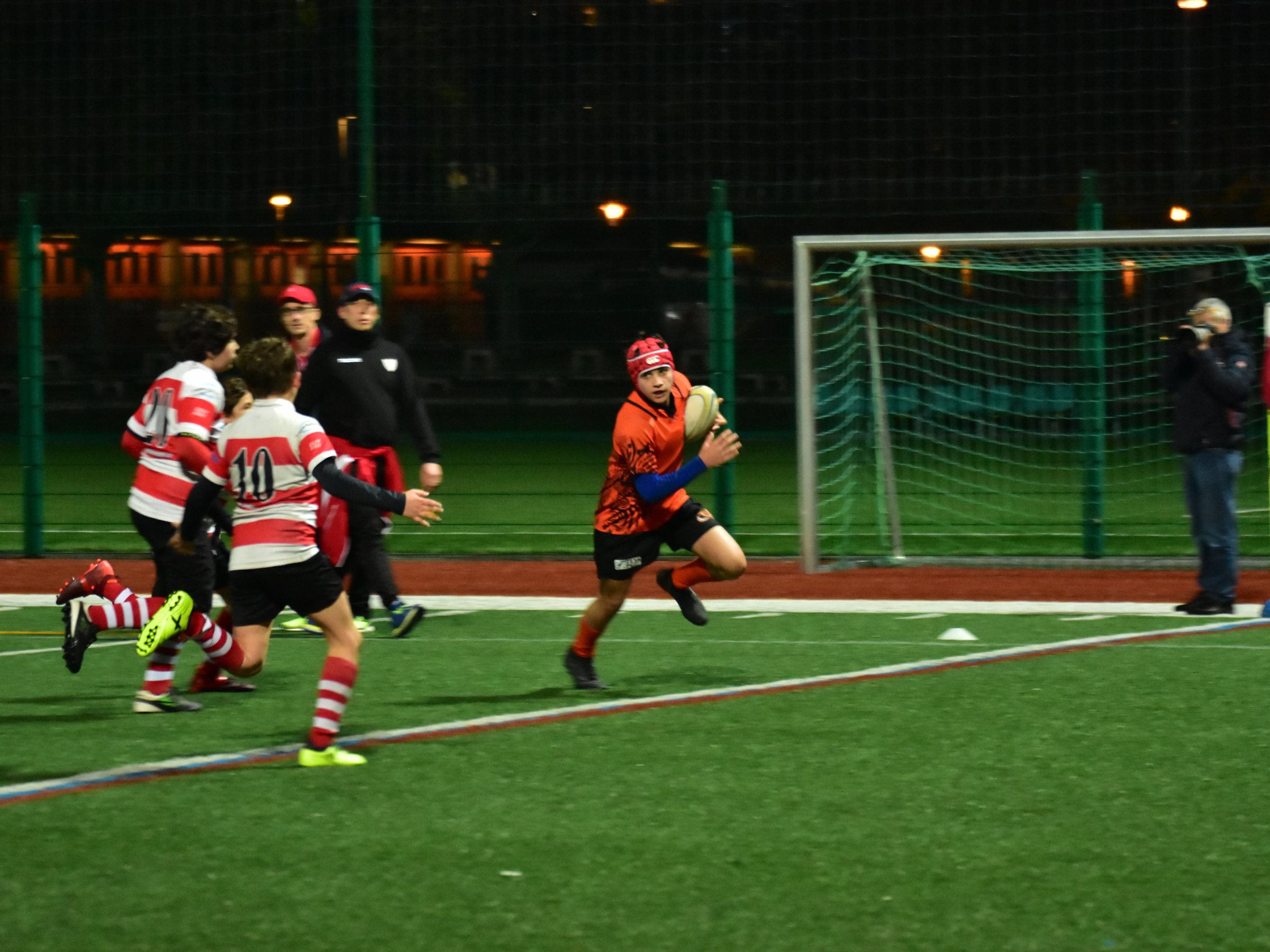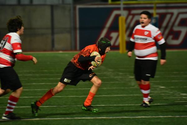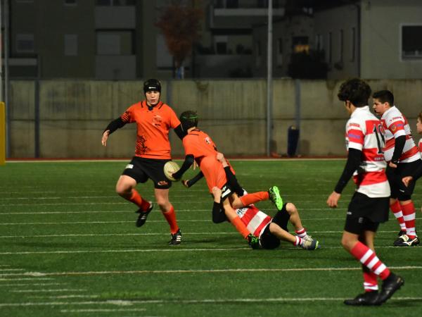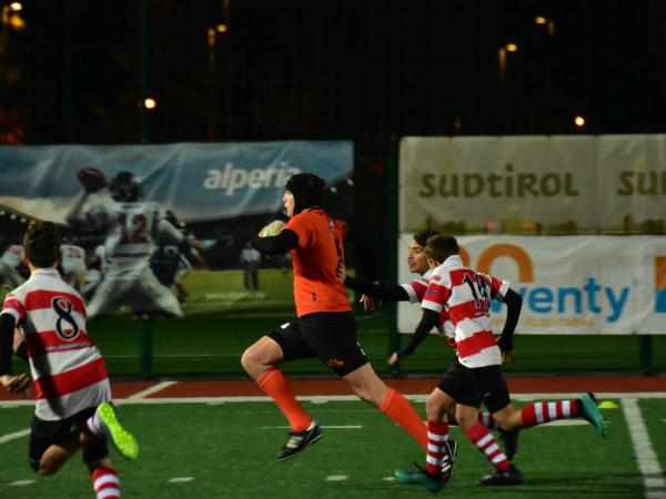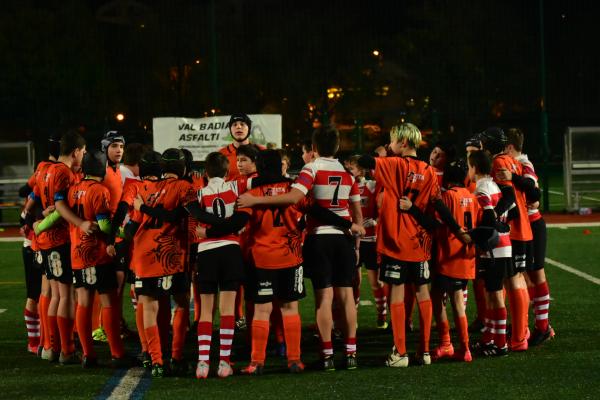 Ore 17 il fischio d’inizio, subito prendiamo la palla ovale e dopo un paio di passaggi, Davide Tisato apre la partita con la prima meta per la nostra U14. Da qui un susseguirsi di mete